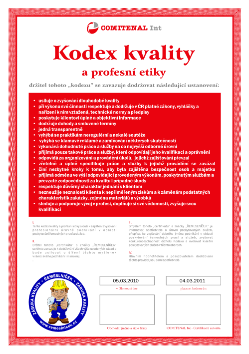Všichni naši partneři se zavázali dodržovat tento „Kodex kvality a profesní etiky” vždy a v plném rozsahu.